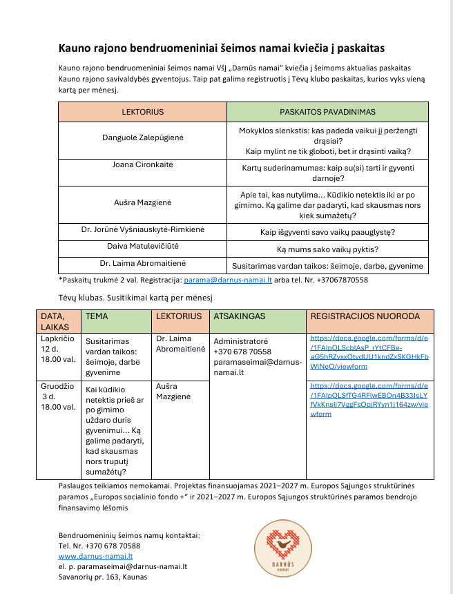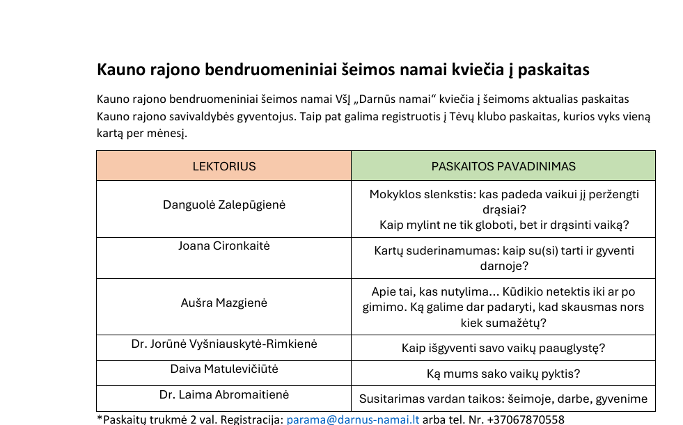 Kauno rajono bendruomeniniai šeimos namai VšĮ „Darnūs namai“ kviečia į šeimoms aktualias paskaitas Kauno rajono savivaldybės gyventojus. (Registracija - parama@darnus-namai.lt arba tel. Nr. +37067870558)