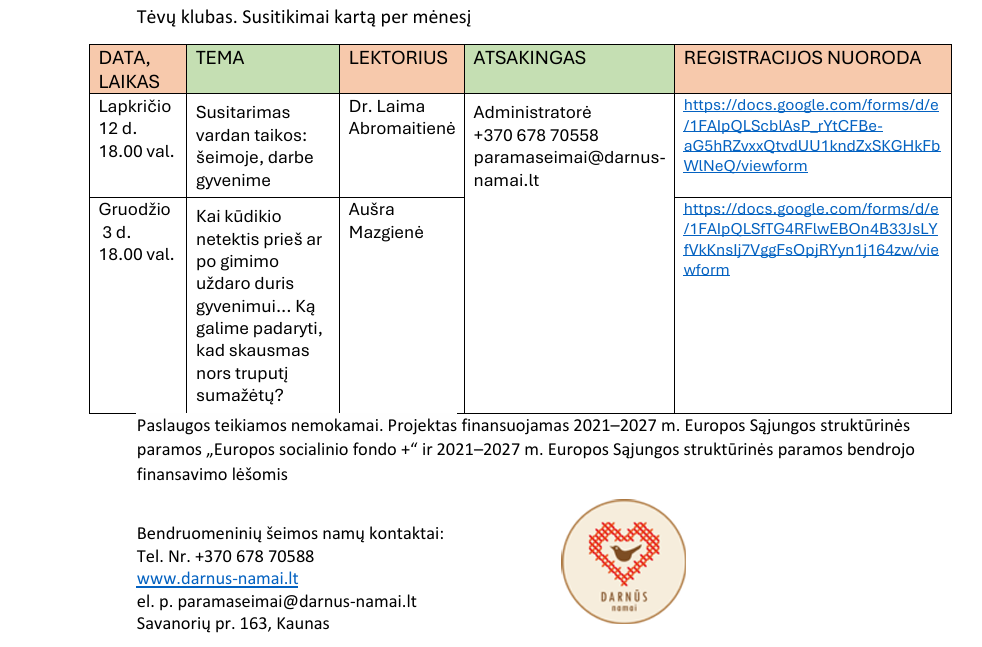Taip pat galima registruotis į Tėvų klubo paskaitas, kurios vyks vieną kartą per mėnesį.