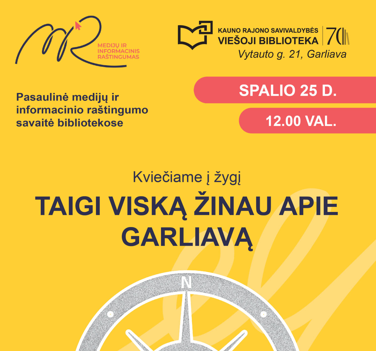 Šis žygis yra Lietuvos bibliotekų organizuojamų renginių, skirtų Medijų ir informacinio raštingumo (MIRKT) savaitei, dalis. Be to, MIRKT temoms skirtas žygis „Taigi viską žinau apie Garliavą“ yra jau paskutinis renginys iš jubiliejinio žygių ciklo Kauno rajone (Kauno rajono ir bibliotekos 70-mečiui pažymėti)!