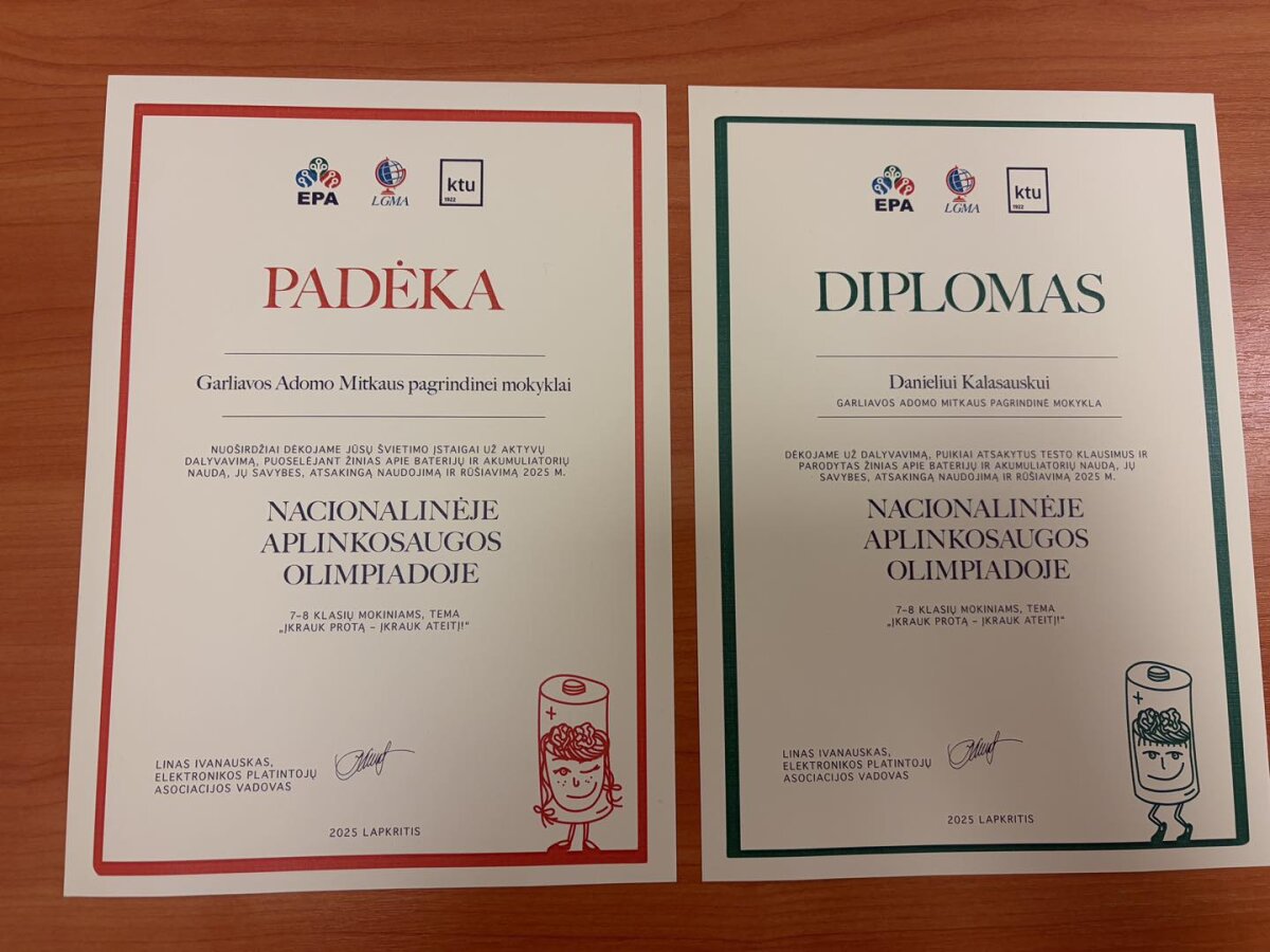 Dėkojame Danieliui Kalasauskui už dalyvavimą Nacionalinėje Aplinkosaugos olimpiadoje ir mokytojoms Irenai Jonelienei bei Janinai Stanaitienei už mokinių skatinimą dalyvauti ir jų paruošimą