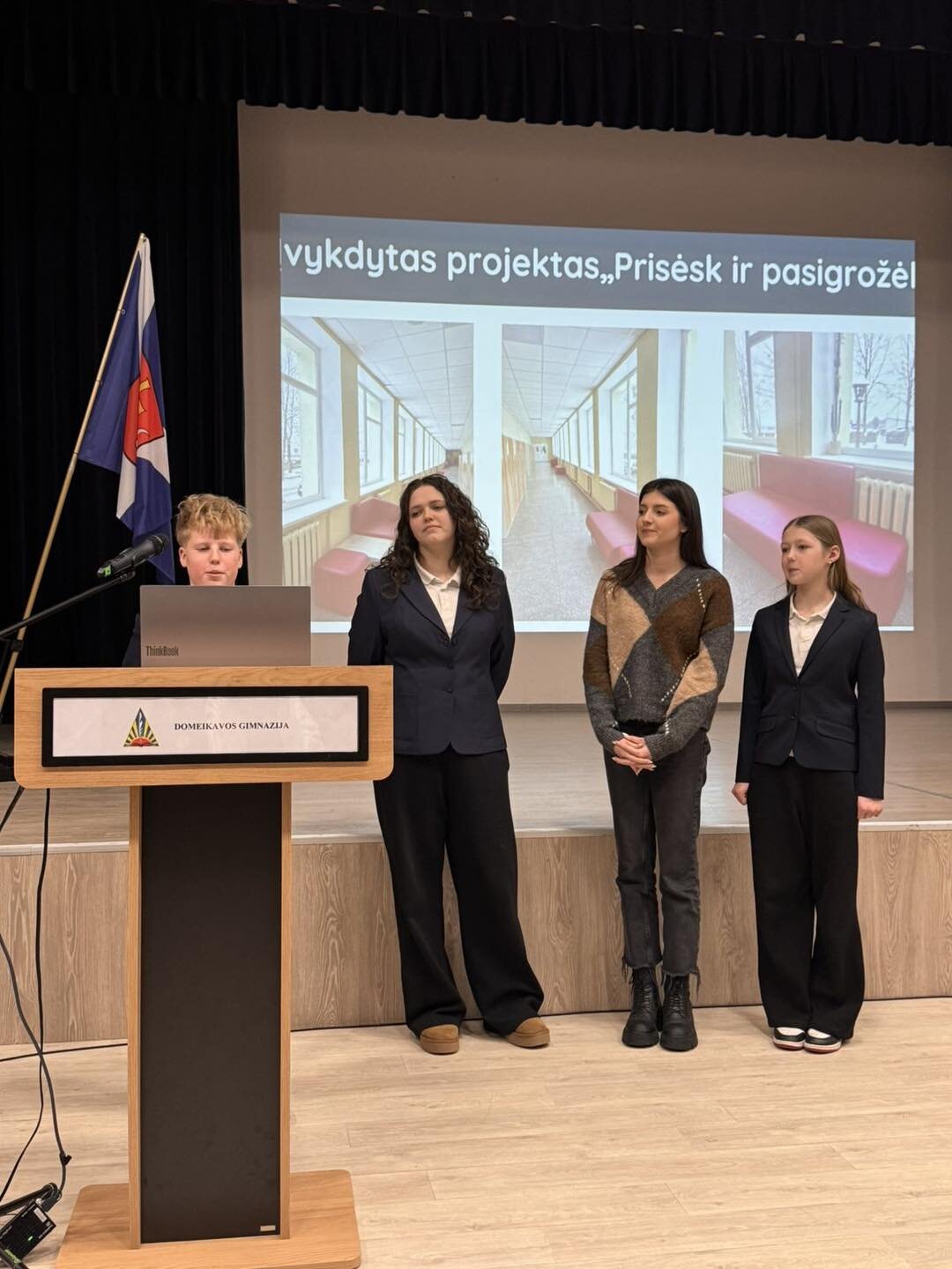Vasario 6 d. Domeikavos laisvalaikio salėje vyko mokinių dalyvaujamojo biudžeto iniciatyvių projektų įgyvendintų idėjų pristatymas. Renginio metu mokinių tarybos nariai pristatė ir mūsų mokykloje 2025 m. įgyvendintą projektą „Prisėsk ir pasigrožėk“