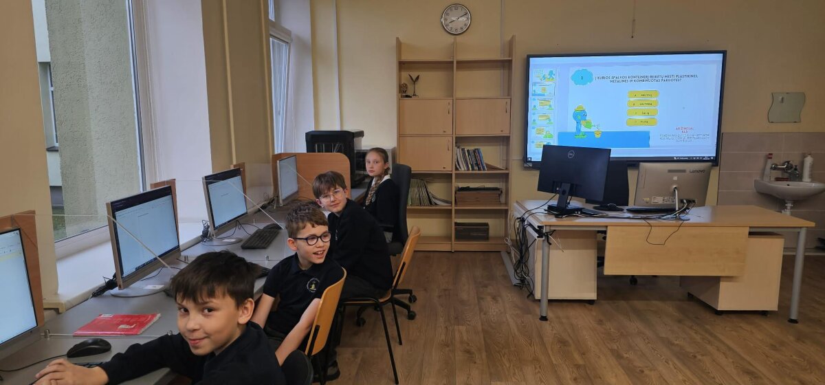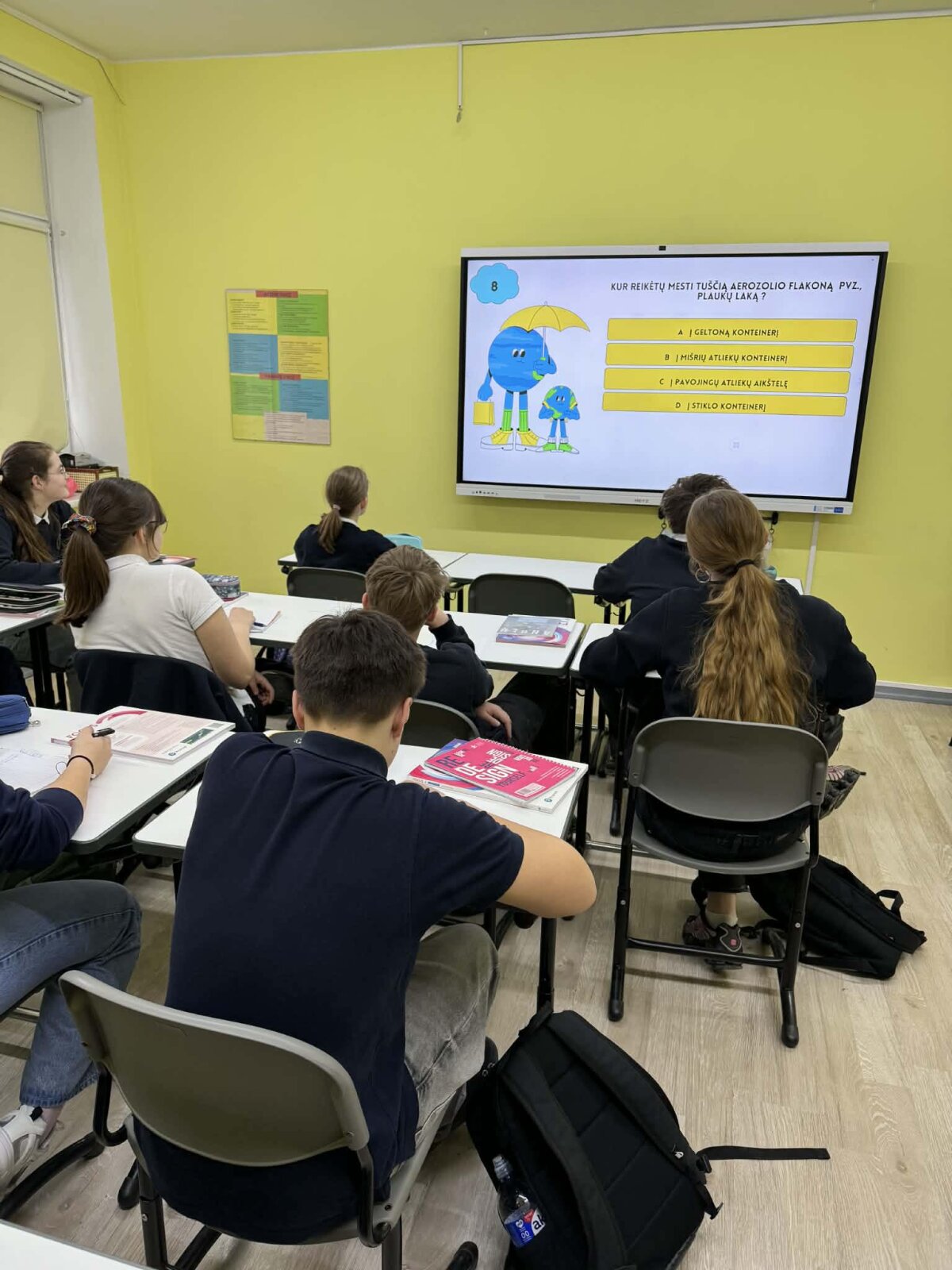 Pirmosios pamokos metu mokytojai kartu su mokiniais žiūrėjo filmuką apie atliekų rūšiavimą bei atliko klausimyną, skatinantį susimąstyti apie kasdienius įpročius.